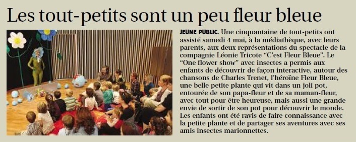 C’est Fleur Bleue – la presse en parle Publié parleonietricote6 septembre 201315 avril 2016Publié dansC'est fleur bleue, Spectacles pour les tout-petitsÉtiquettes :Limousin, spectacle adapté tout petits, spectacle pour crèche Partager : Partager sur X(ouvre dans une nouvelle fenêtre) X Partager sur Facebook(ouvre dans une nouvelle fenêtre) Facebook Publié par leonietricote Léonie tricote est une gentille petite compagnie qui crée des spectacles pour les tout-petits Voir plus d’articles
