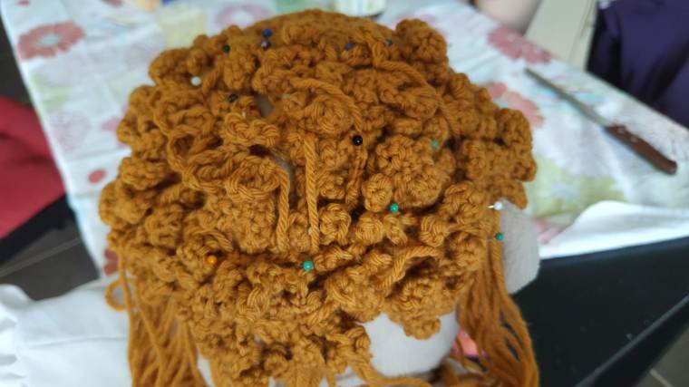 La chevelure est réalisée au crochet. En plus d’imiter des bouclettes, c’est un clin d’ œil au précédent spectacle Catarina Barba Fina!
