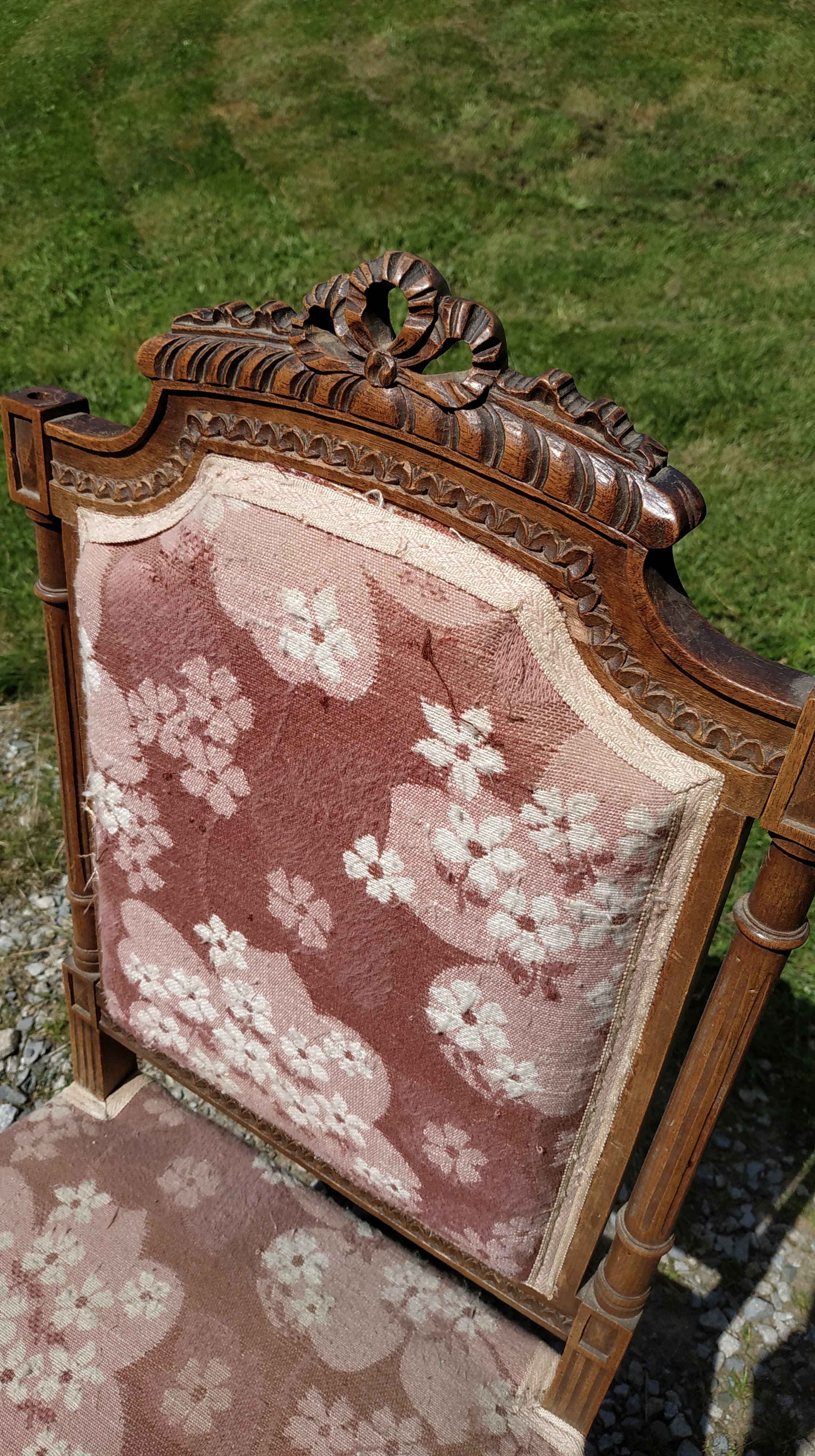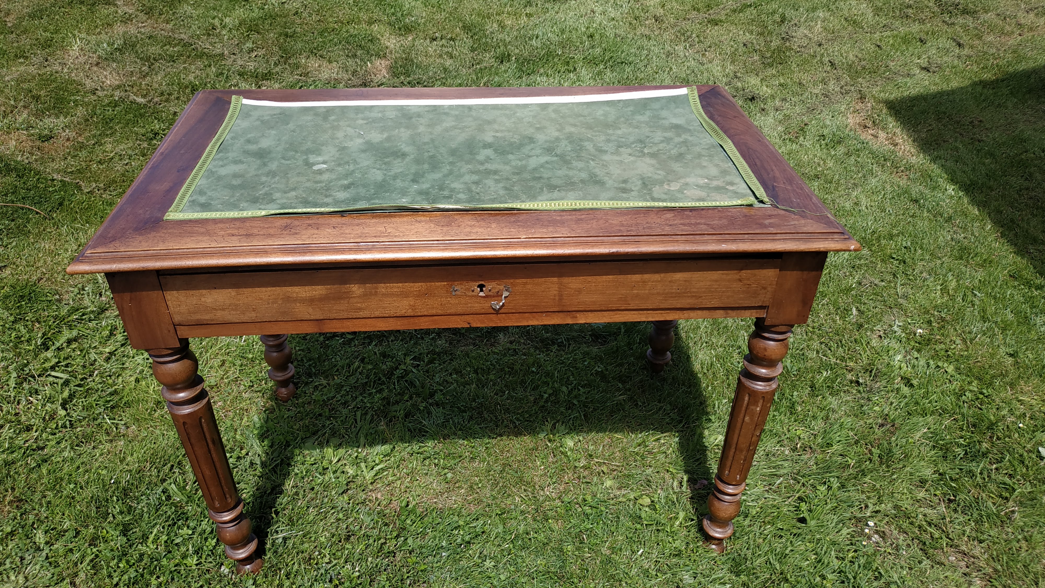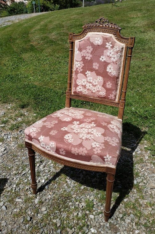 Nous avons déniché le bureau et les chaises dans une brocante (au Moulin de la Mie à Saint Priest sous Aixe). Ils sont de style Louis XVI, mais visiblement au milieu du XIXè siècle, on mélangeait allègrement les styles de toutes les époques : cela m’arrange, le style Louis XVI est mon préféré!