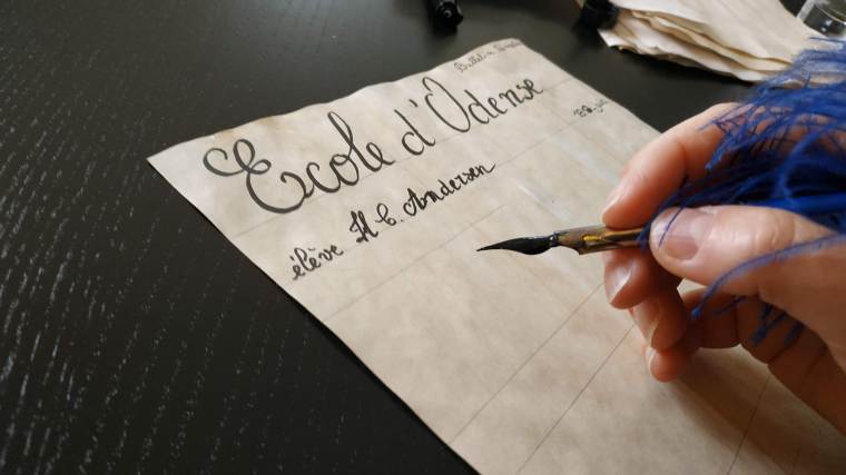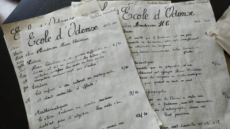 Dans la malle aux souvenirs, Jenny Lind va trouver les bulletins de notes d’Andersen. Nous avons fait du faux vieux papier et je me suis amusée à écrire de faux bulletins à la plume. Les commentaires des professeurs sont humiliants, comme on pouvait imaginer qu’ils l’étaient à cette époque et peut-être même il n’ y a pas si longtemps… Mais tout ceci est du pur fake bien sûr!!